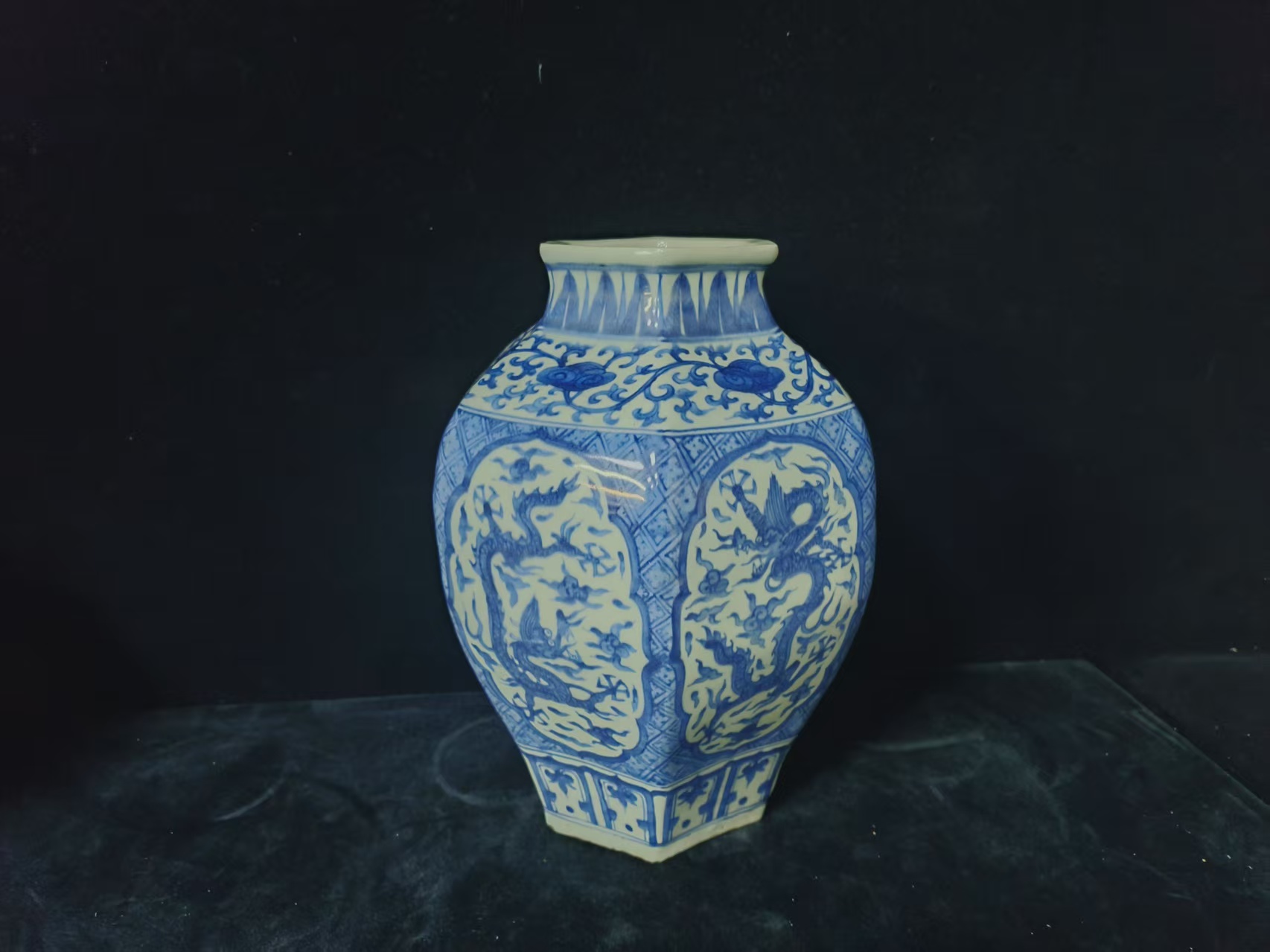 明-青花万历龙纹开光六棱罐