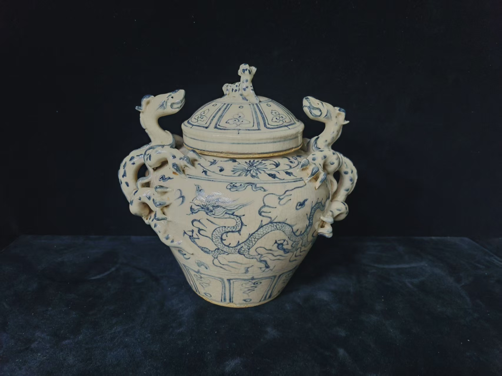 元-青花龙纹双耳堆塑龙盖罐尊