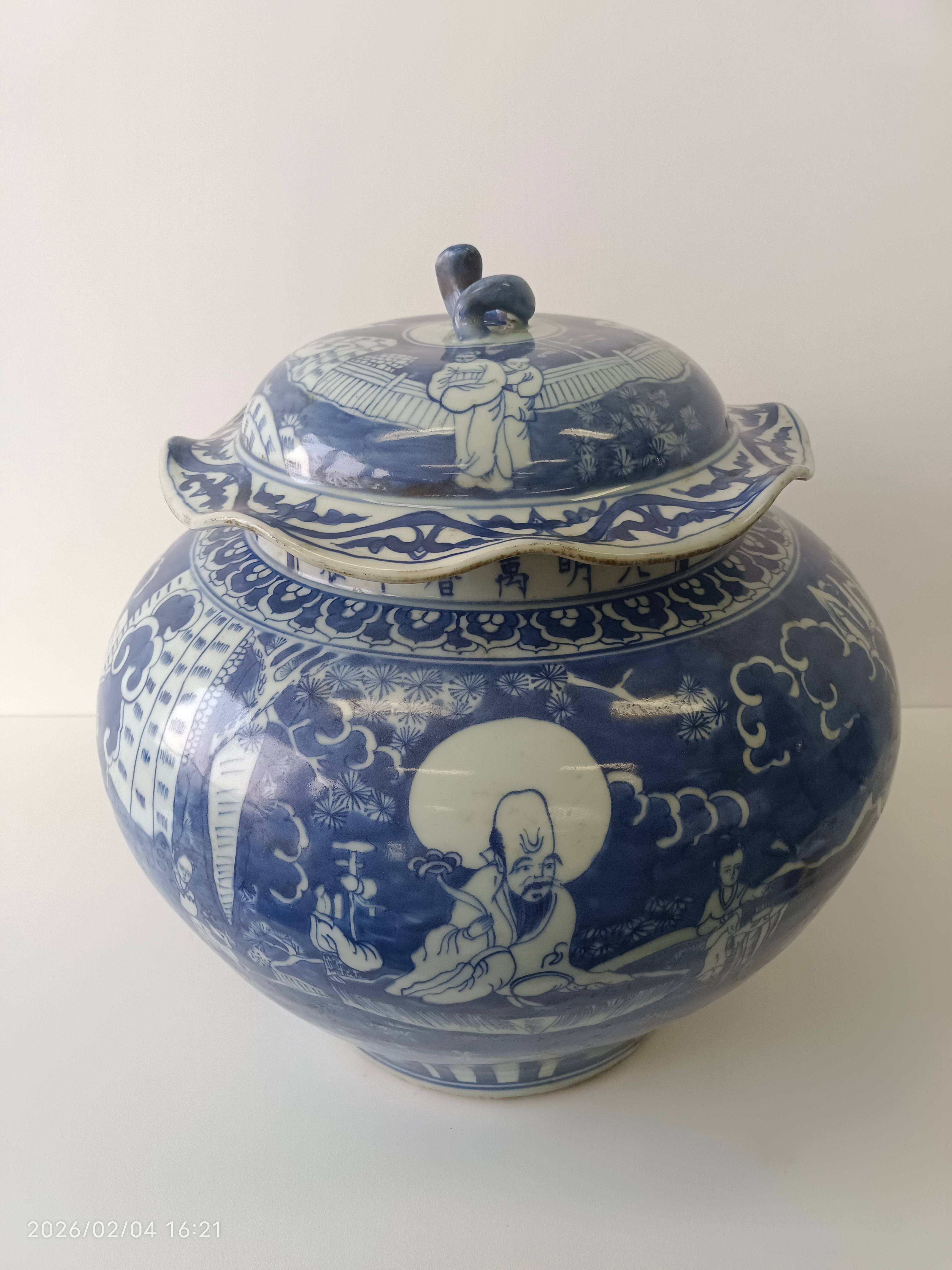 明代万历青花人物故事纹荷叶盖罐