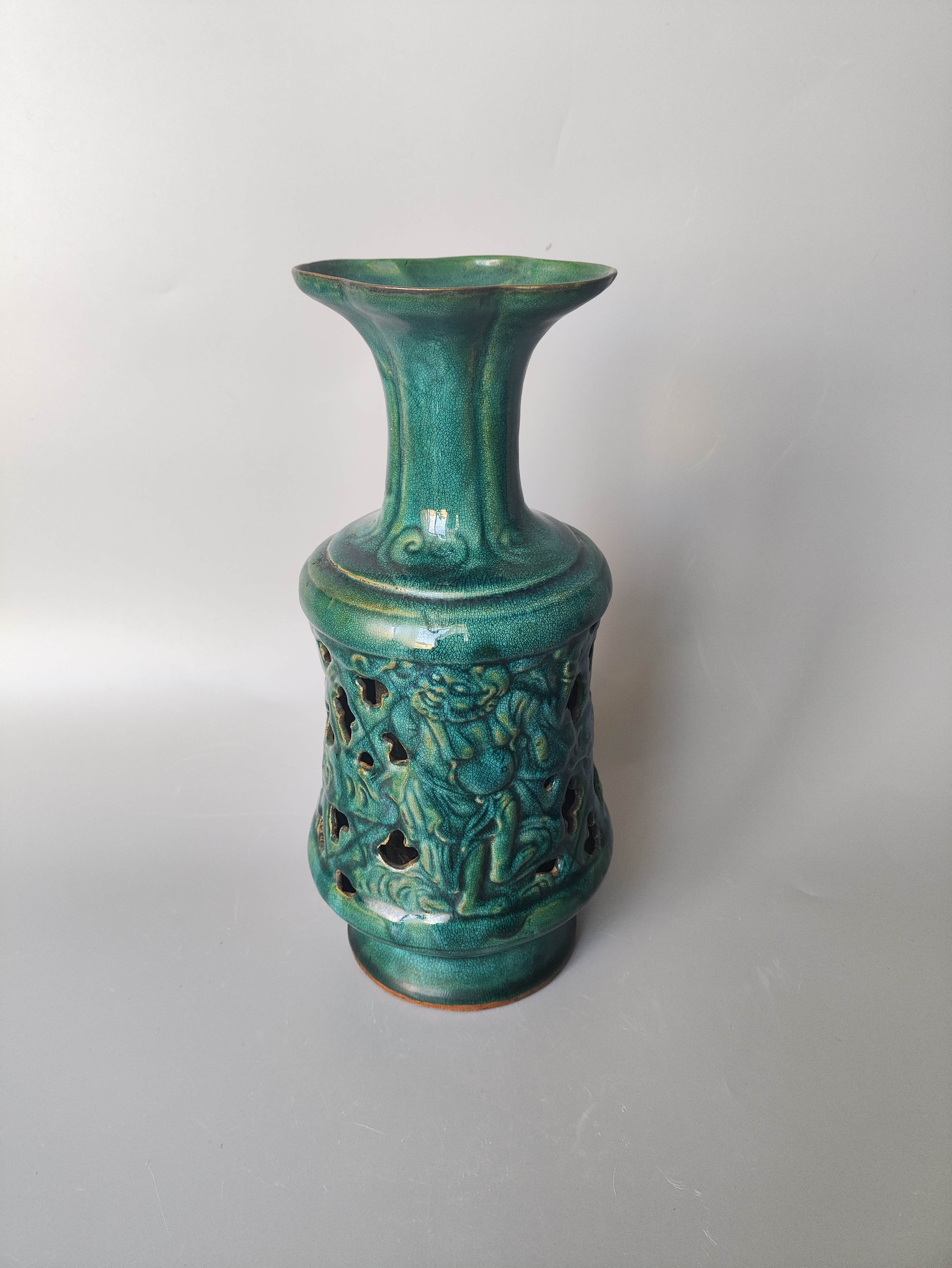 宋代孔雀蓝離刻仙人花口瓶柴字款
