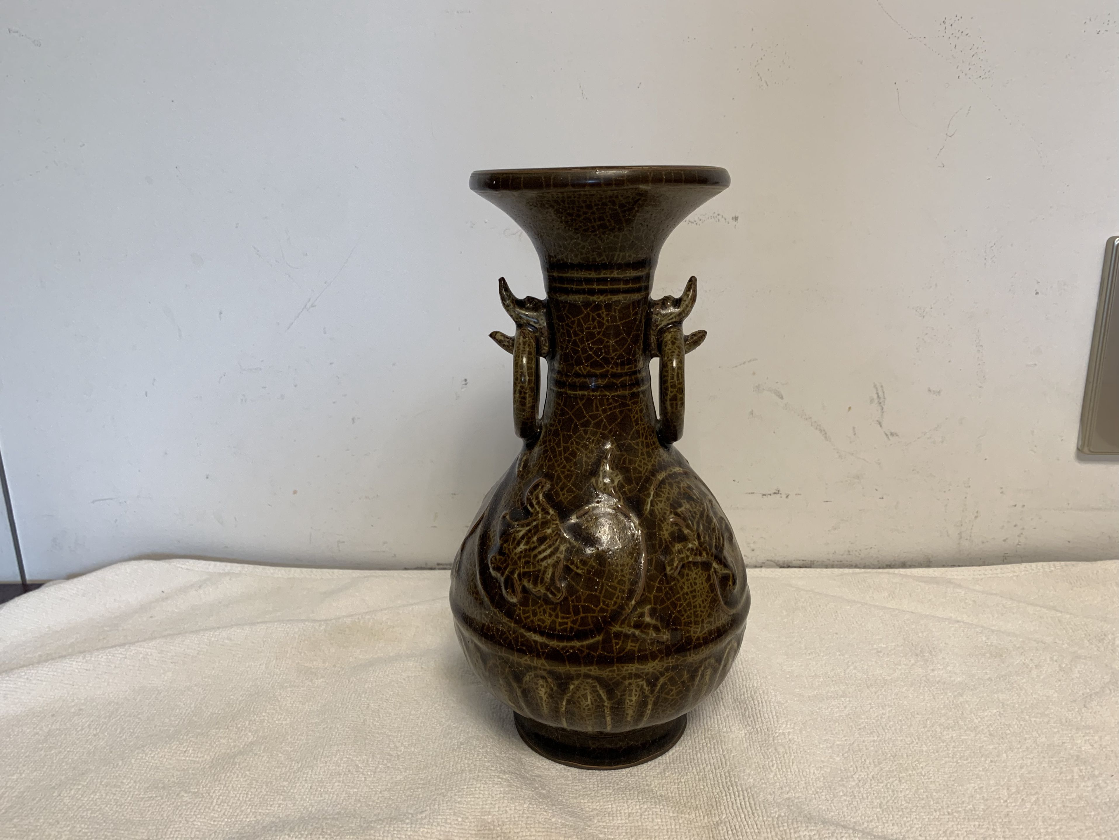 南宋官窑青釉双耳瓷瓶(修内司窑款)