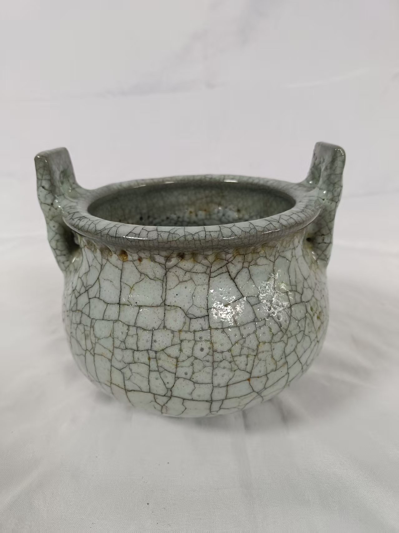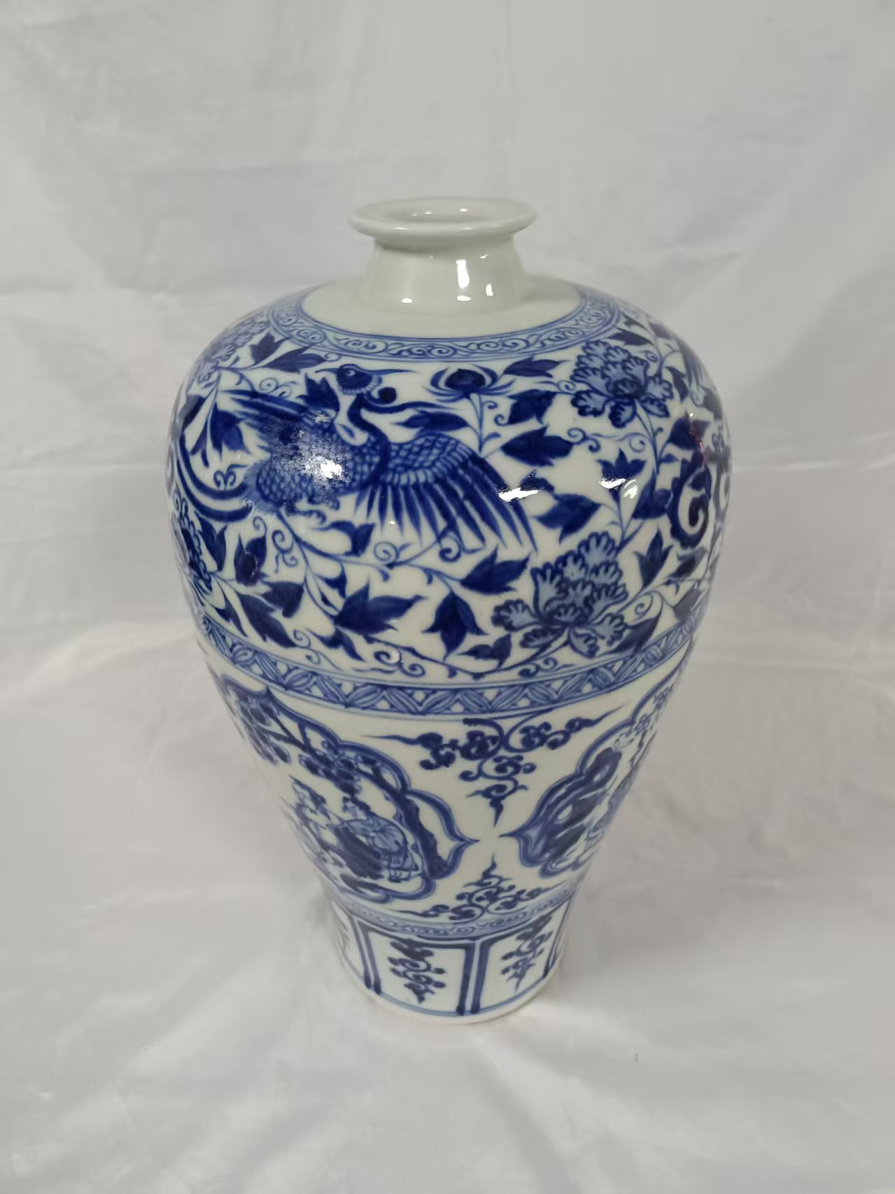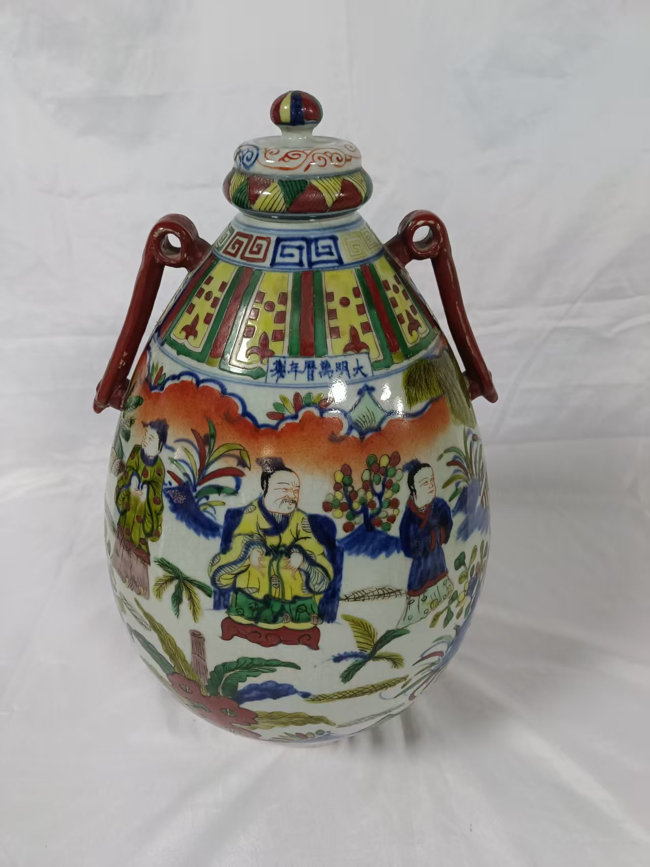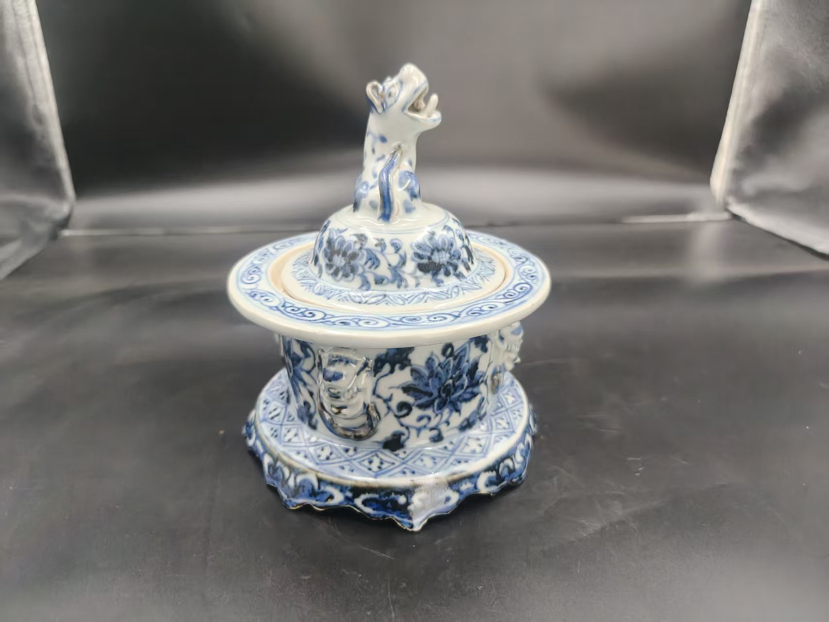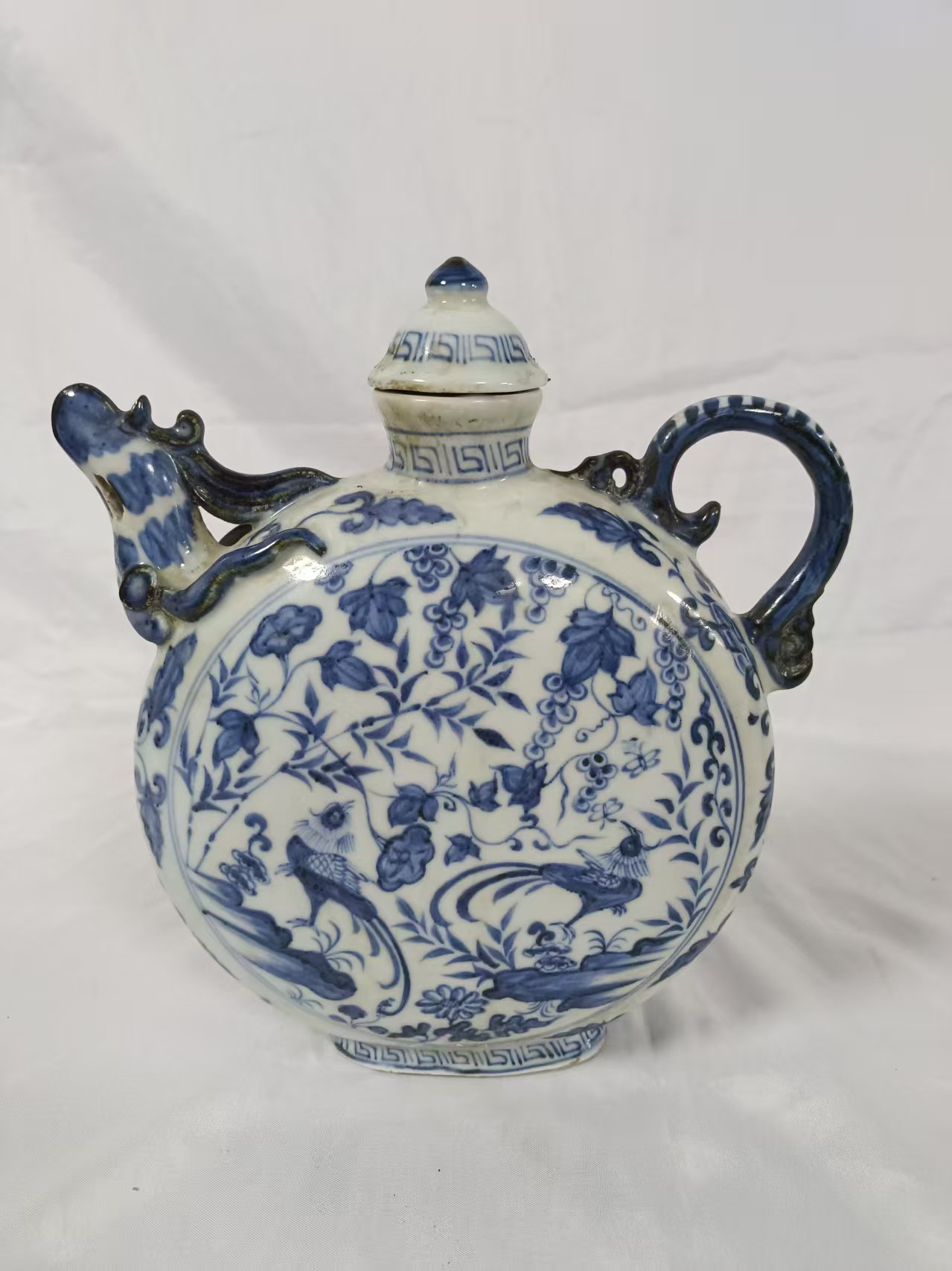 青花凤凰鸳鸯花卉纹双耳兽盖罐