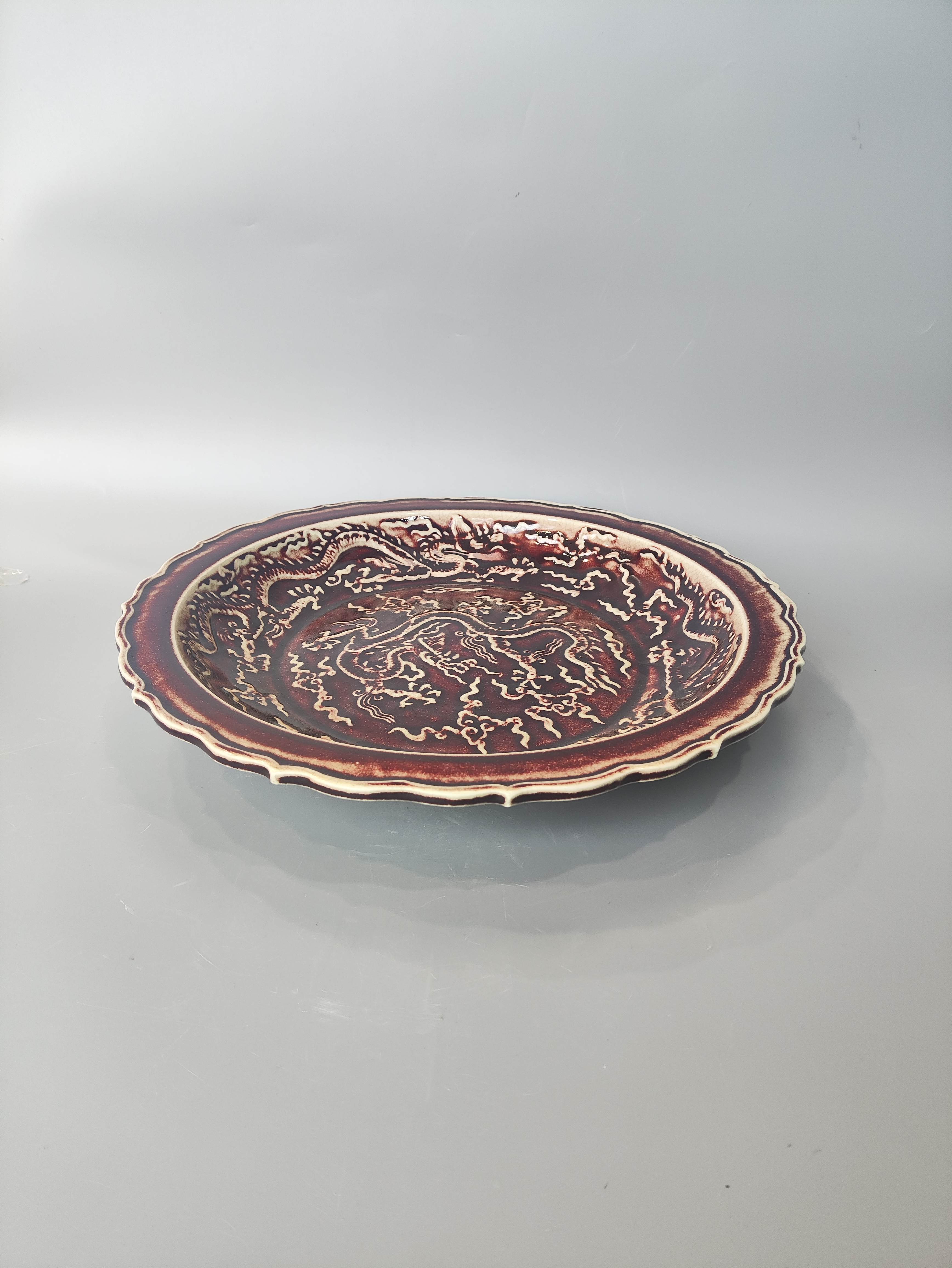 明釉里红龙纹葵口盘
