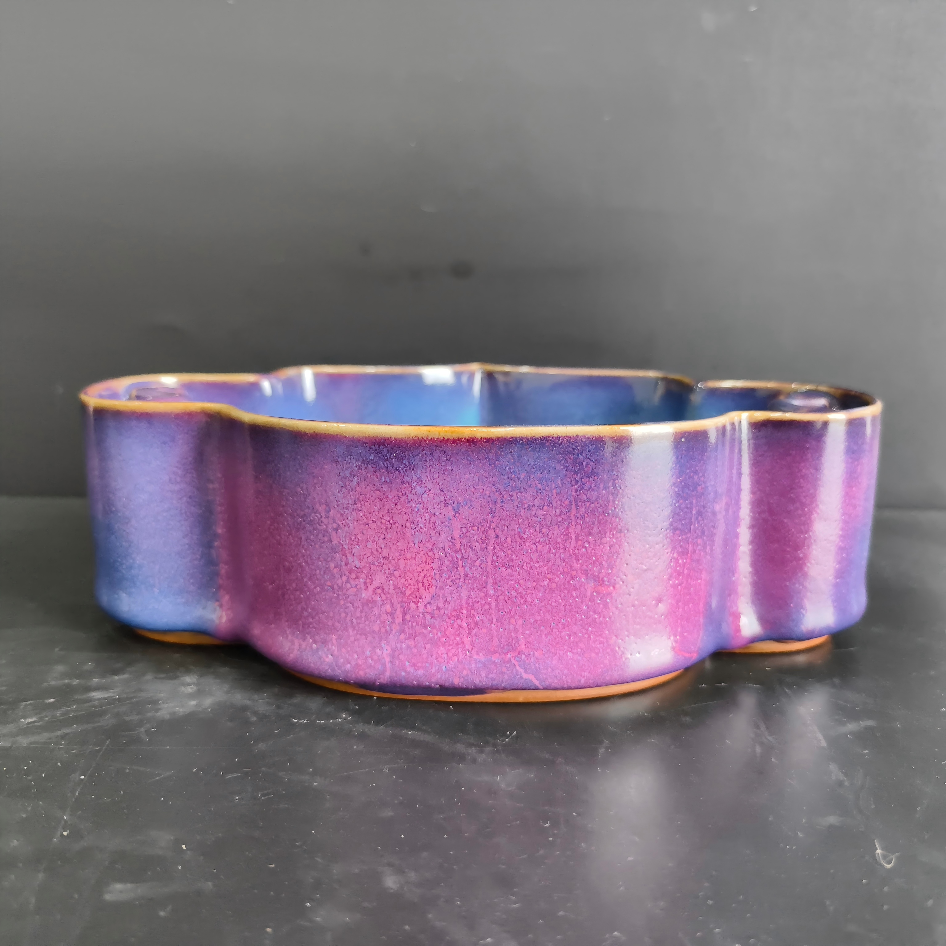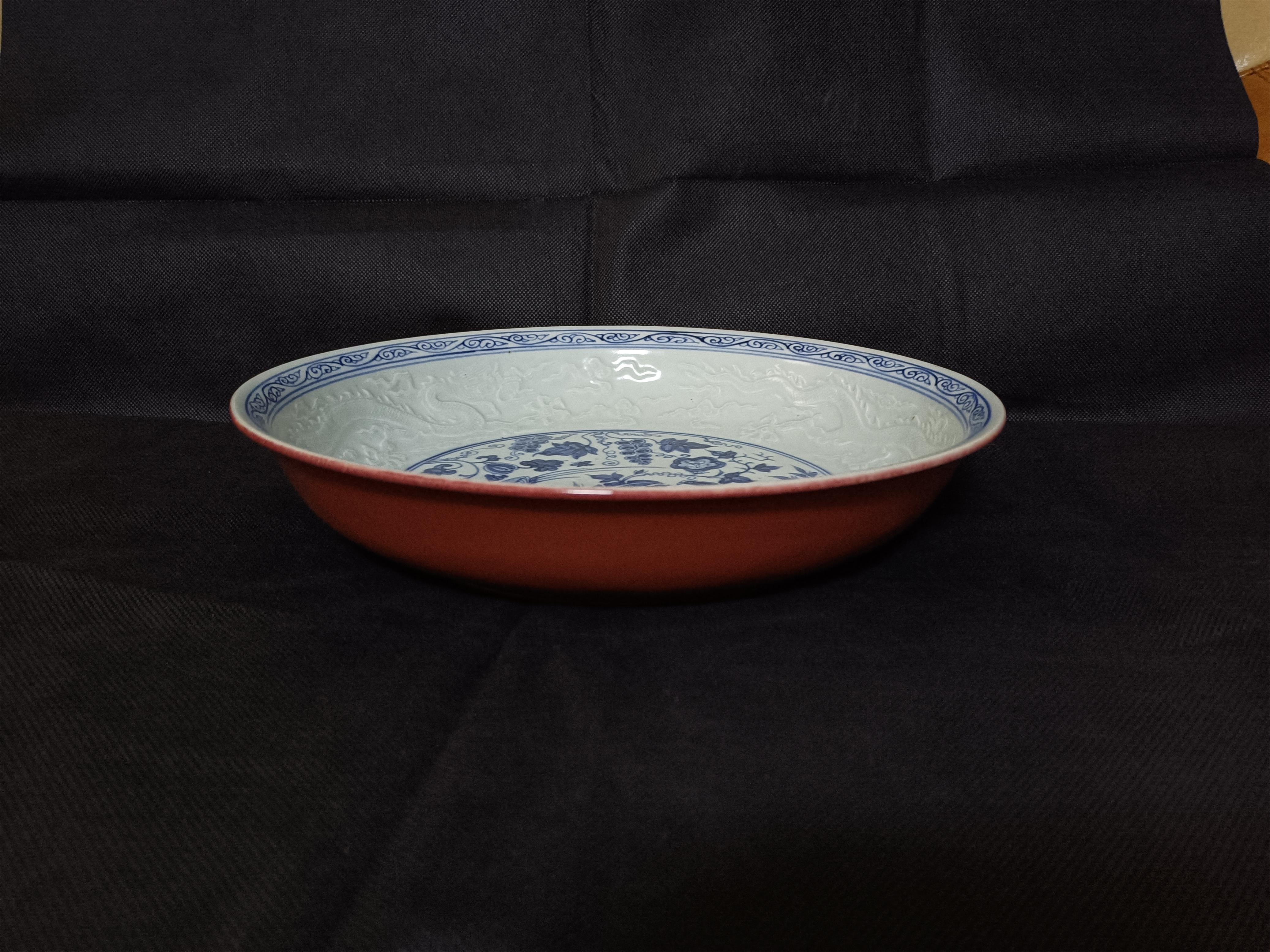永乐青花绶带鸟葡萄蕉石纹祭红釉大盘