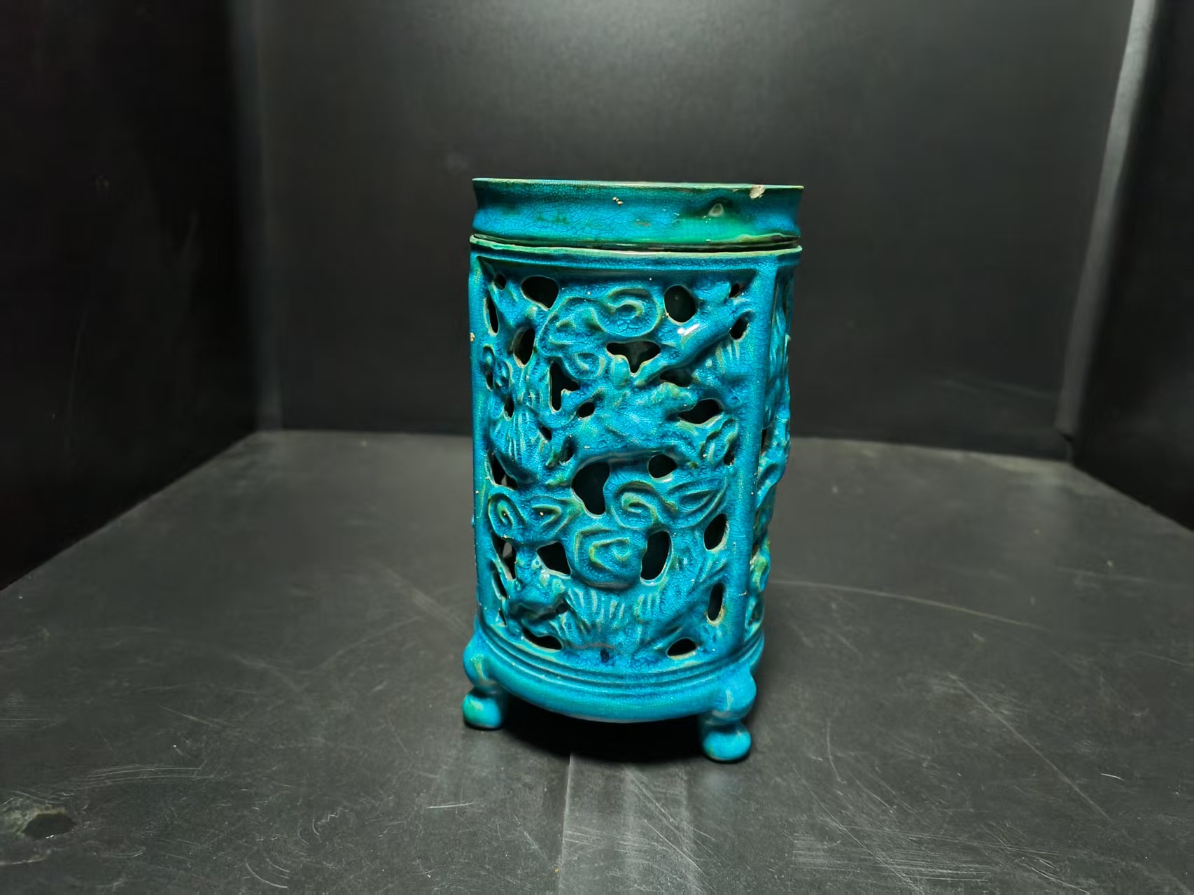柴窑蓝釉镂空三足熏炉