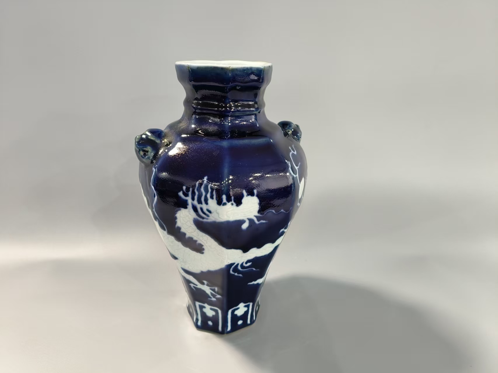 宣德款祭蓝釉兽耳留白龙纹盘口尊