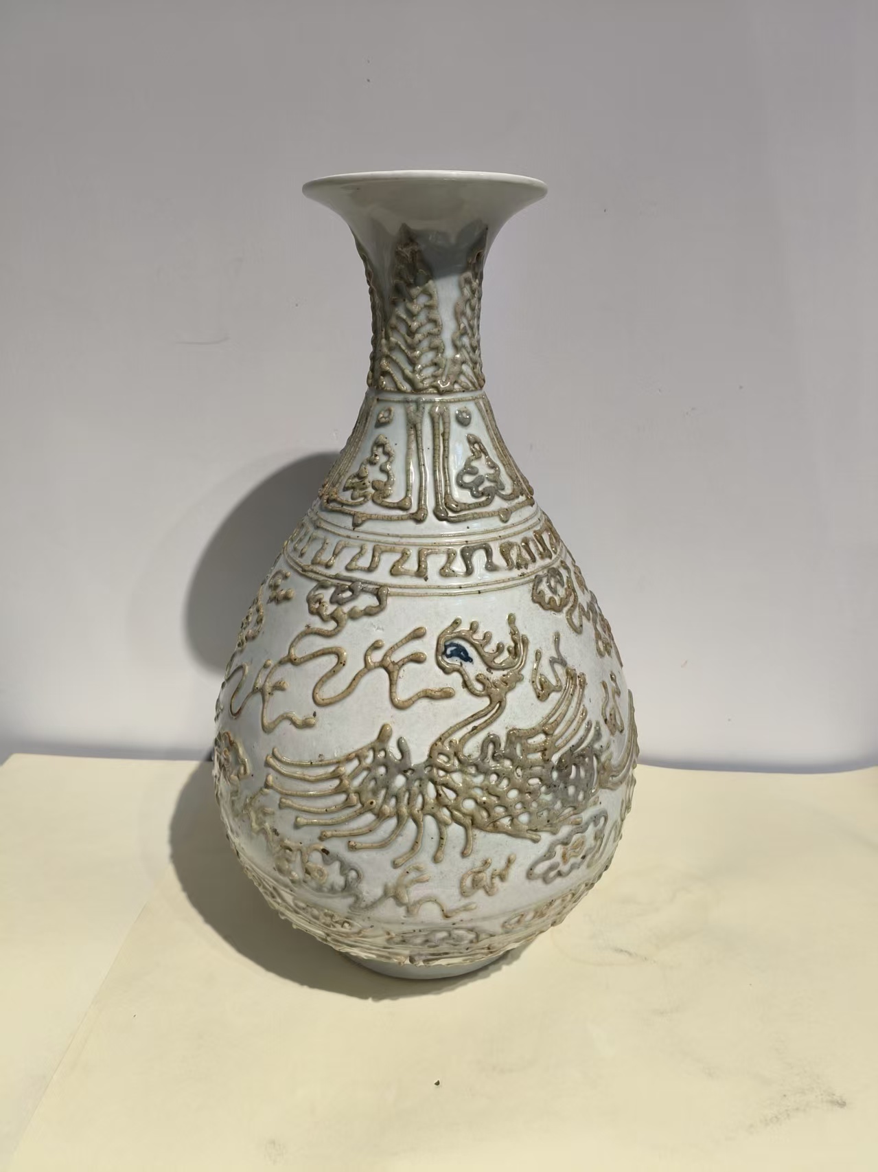 沥粉月白釉青花凤鸟祥云纹玉壶春大瓶