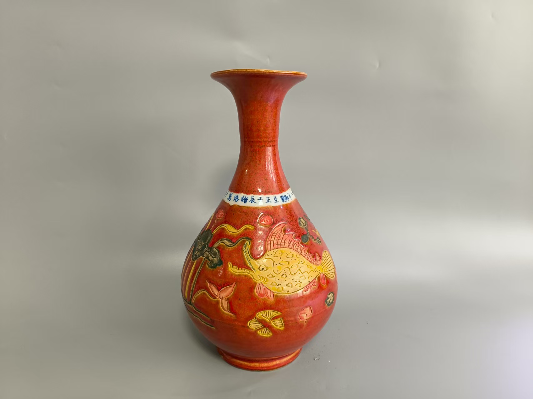青花款釉里红鱼草纹玉壶春瓶