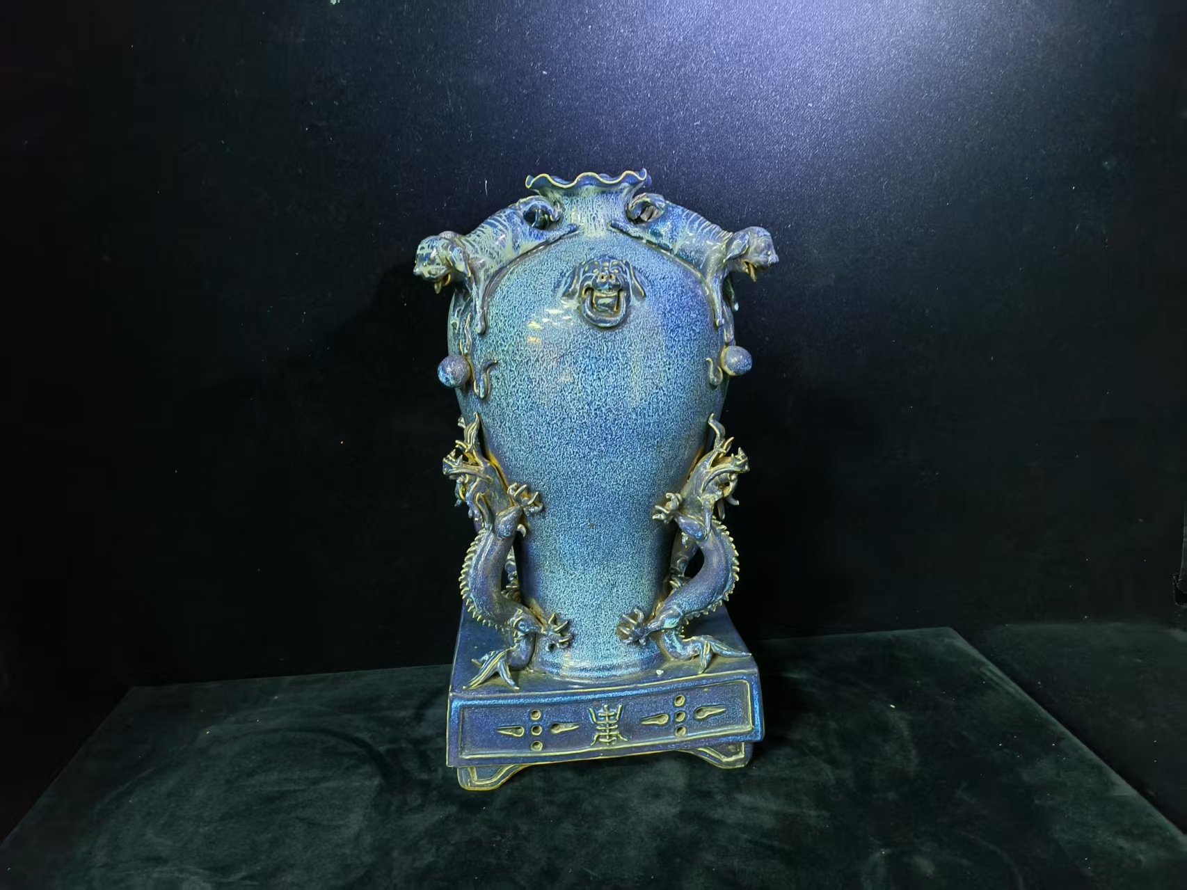 清-乾隆刻款炉钧釉龙虎雕塑双耳连座尊