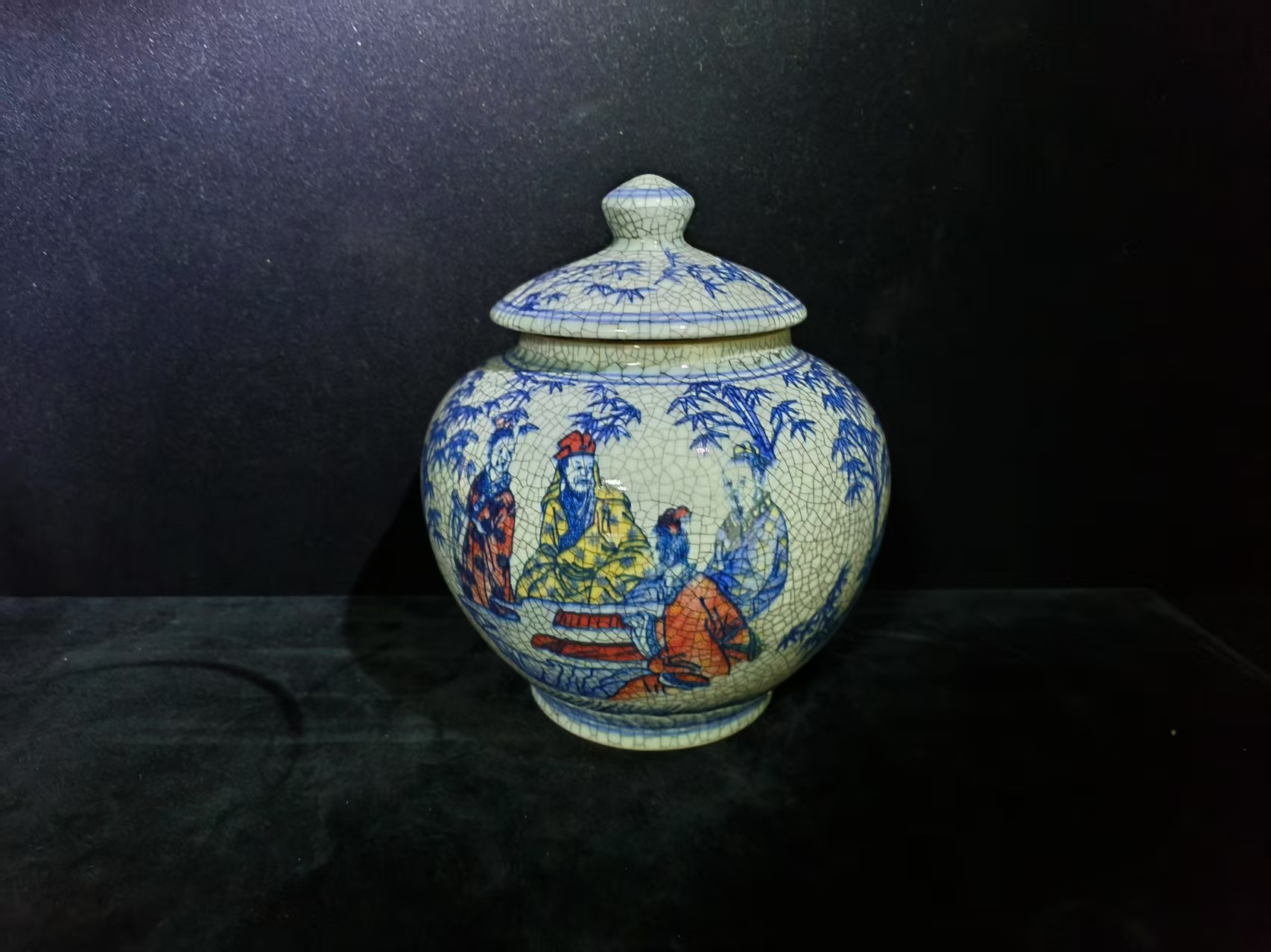 清早期-青花五彩竹林七贤盖罐
