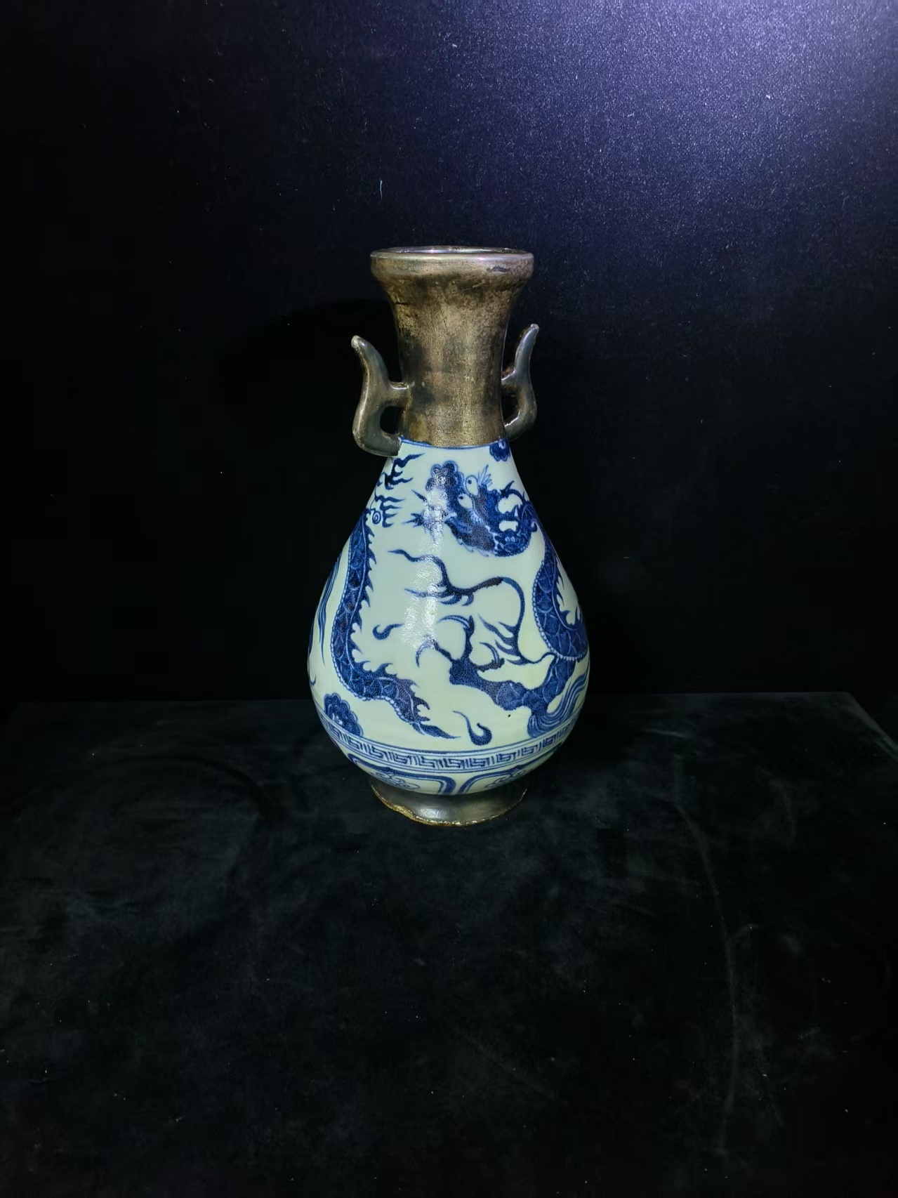 元-青花龙纹口鎏金双耳尊