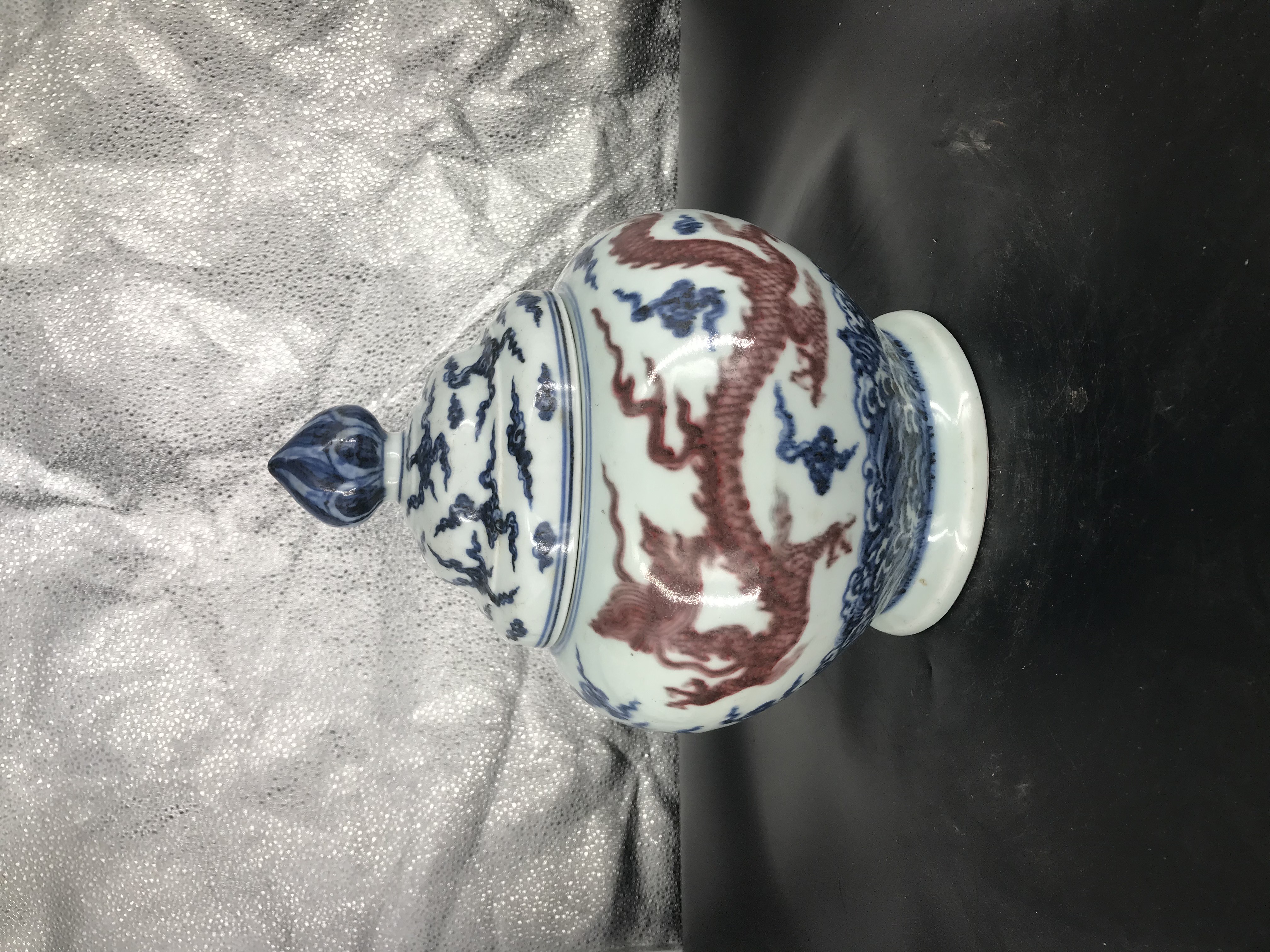 明宣德青花釉裡紅海水龍紋蓋罐