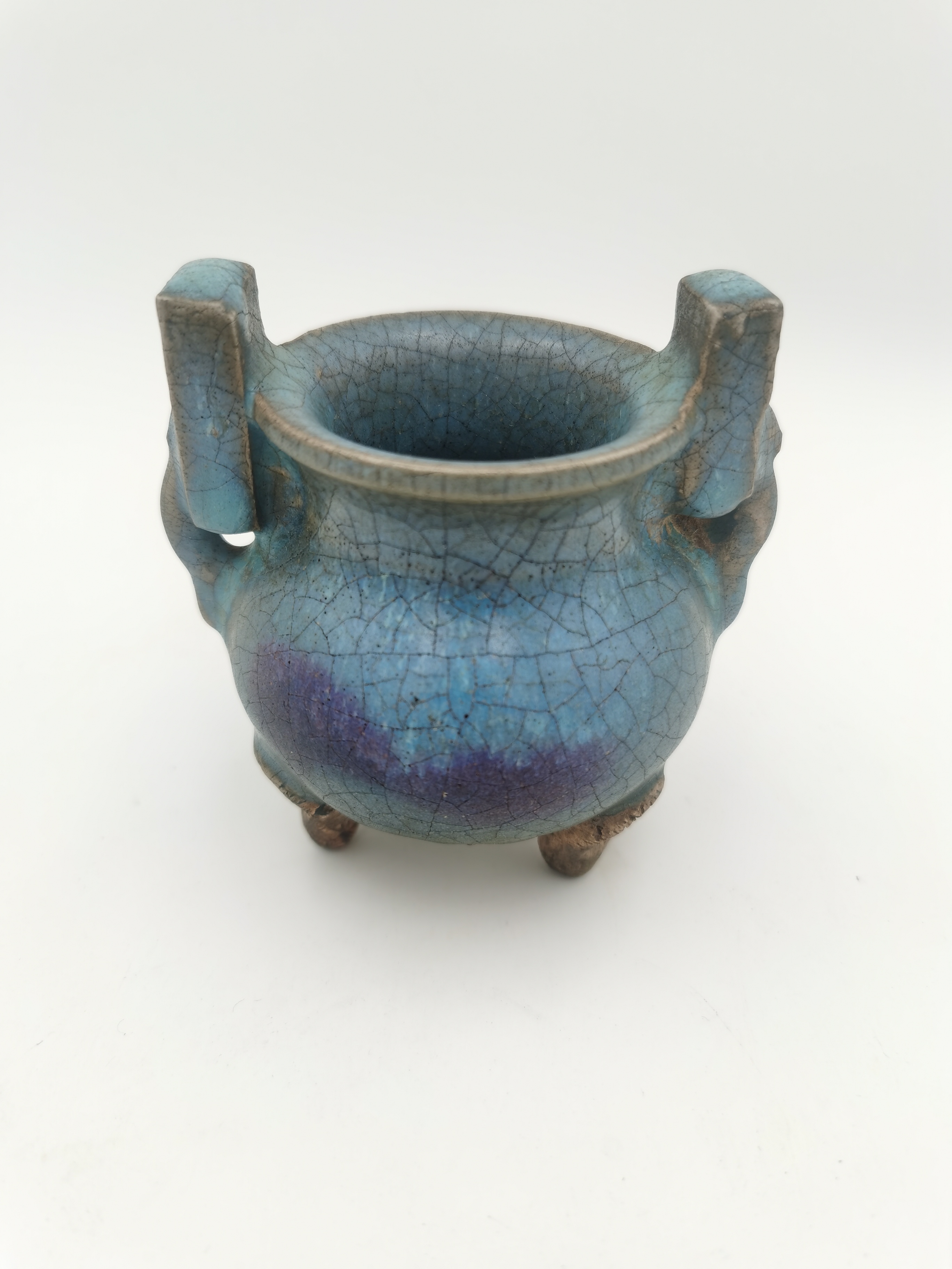 元代天蓝釉紫斑立耳三足香炉