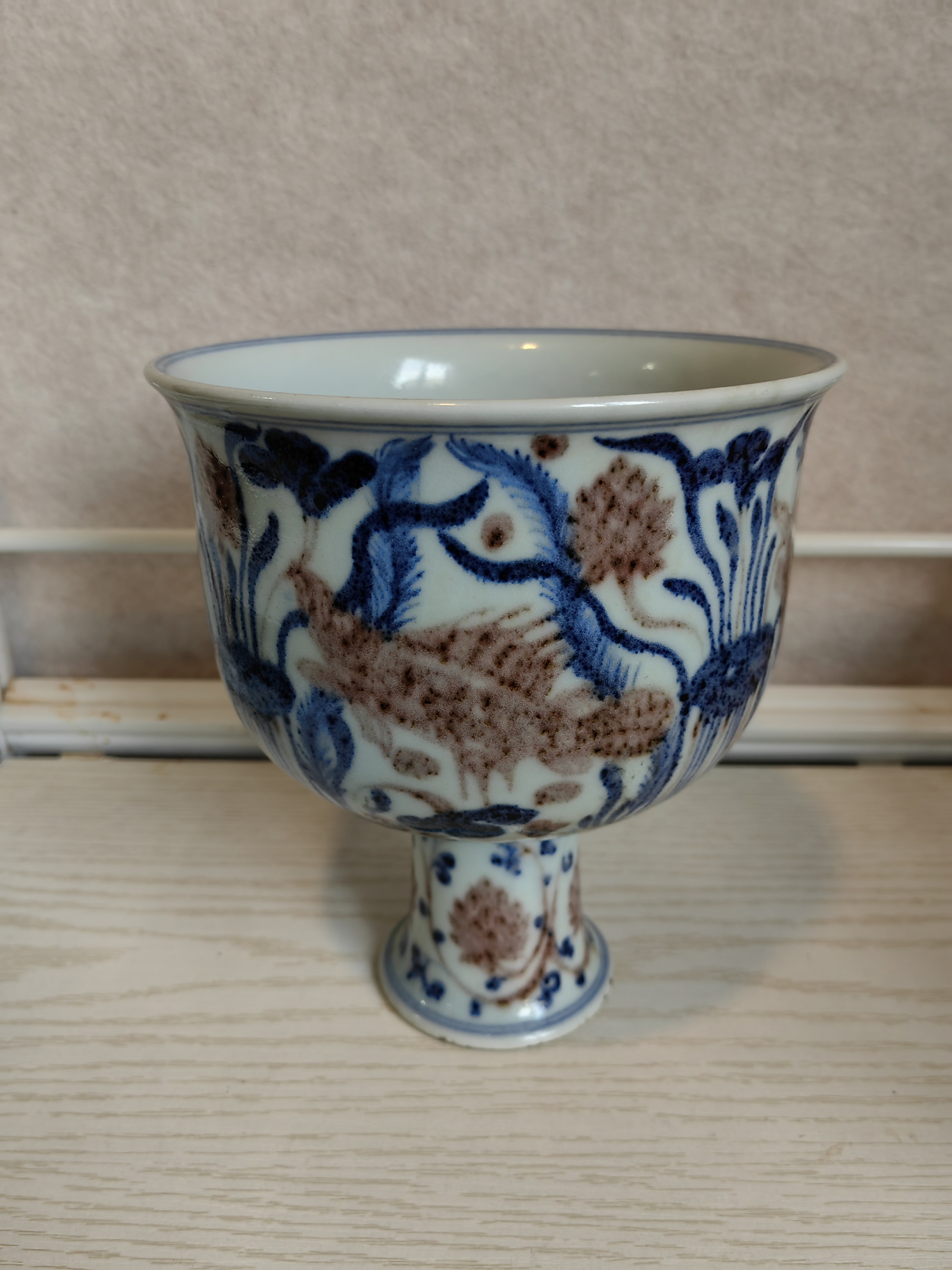 明宣德青花釉里红鱼藻纹高足碗